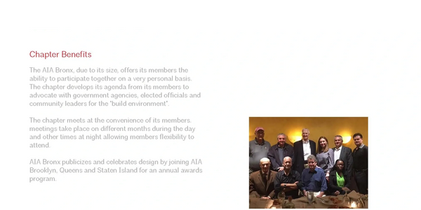 The AIA Bronx, due to its size, offers its members the ability to participate together on a very personal basis. The chapter develops its agenda from its members to advocate with government agencies, elected officials and community leaders for the "built environment". The chapter meets at the convenience of its members. Meetings take place on different months during the day and other times at night – allowing members flexibility to attend.